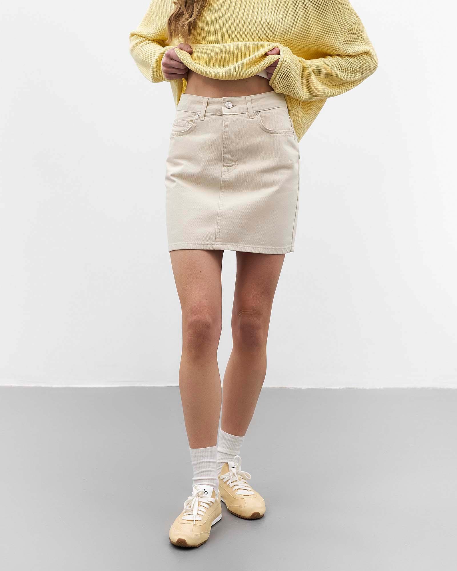 Однотонна джинсова мініспідниця приталеного крою. Модель з високою посадкою, петельками для ременя на поясі, п'ятьма кишенями та обробленим рівним...