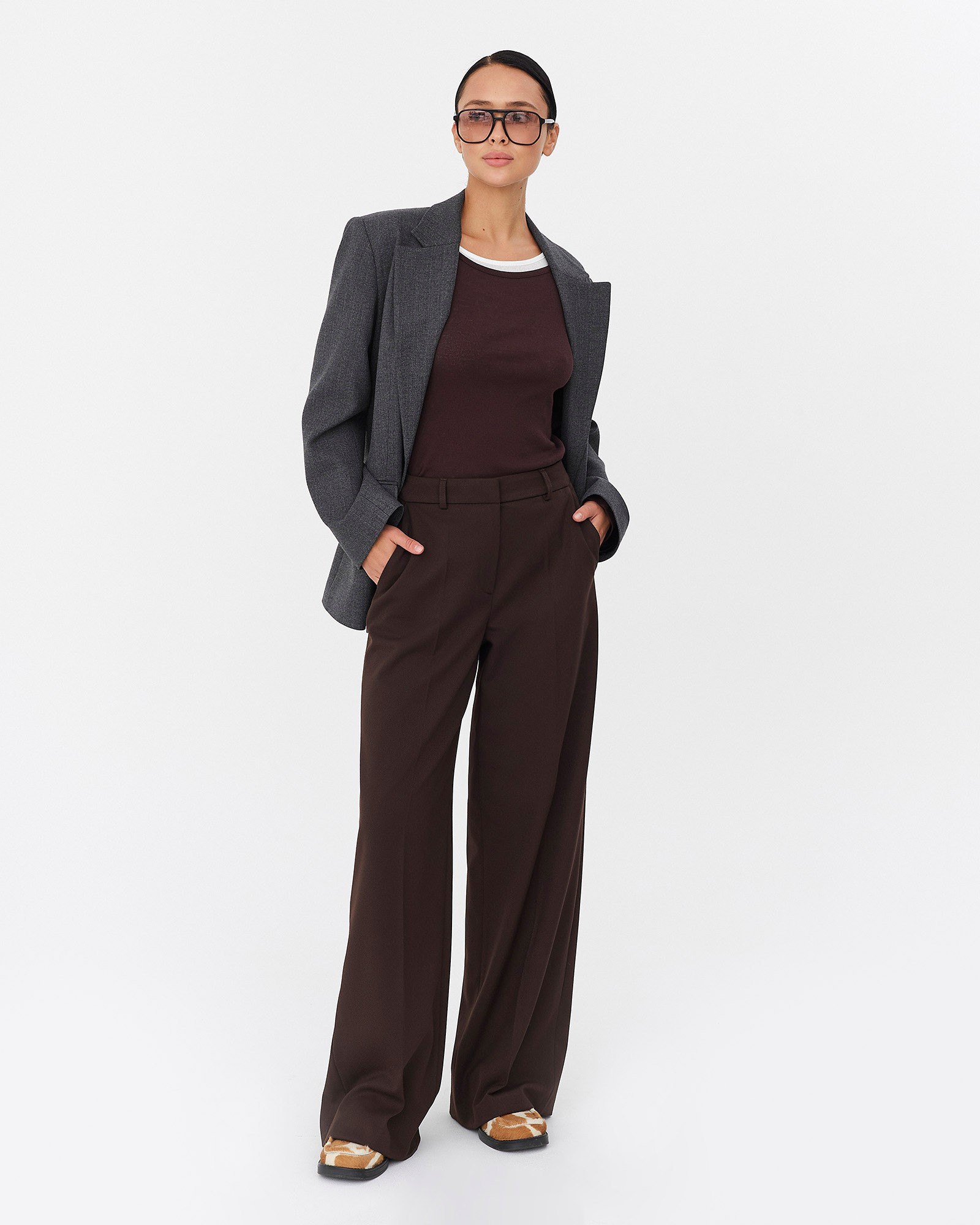 Однотонні штани-палацо з високою посадкою, боковими кишенями, стрілками спереду і ззаду, петельками для ременя на поясі та рівним обробленим...