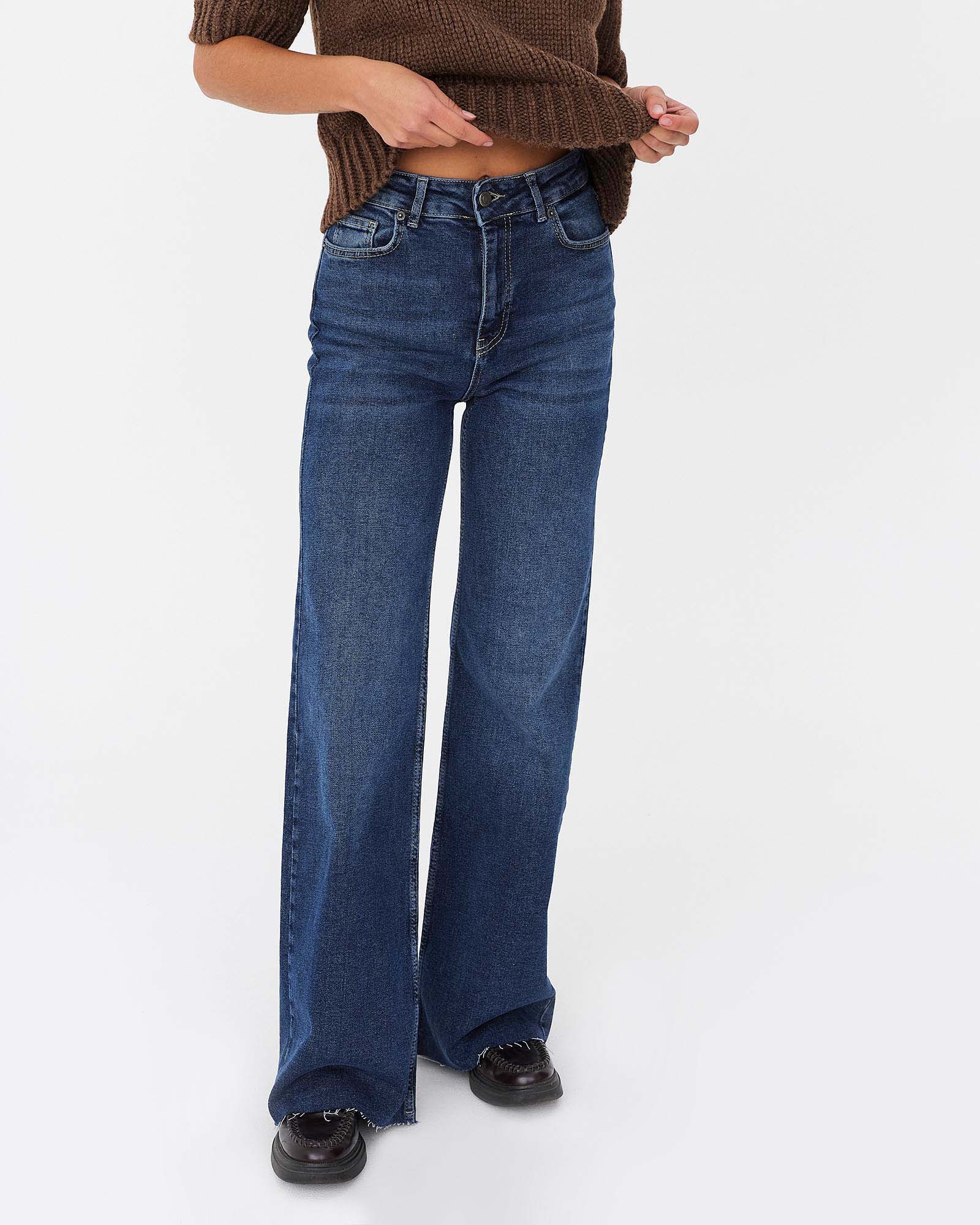 Однотонні джинси з широкими штанинами. Модель з високою посадкою, потертостями, п'ятьма кишенями та рівним обробленим низом. Застібаються на...