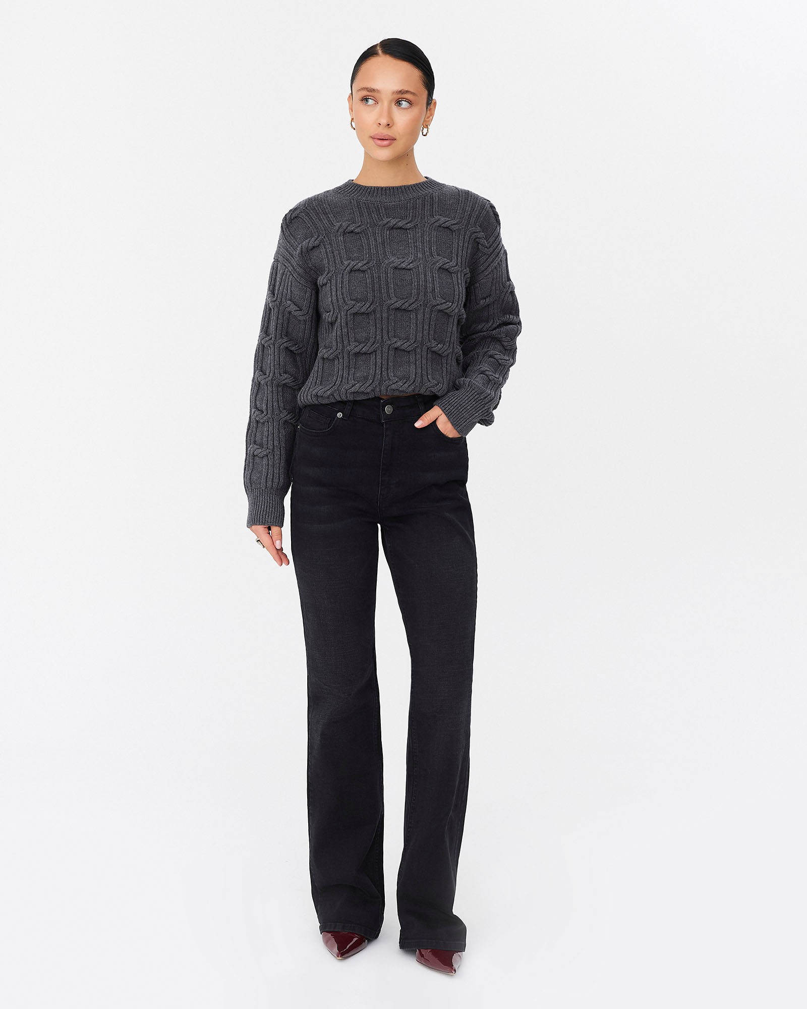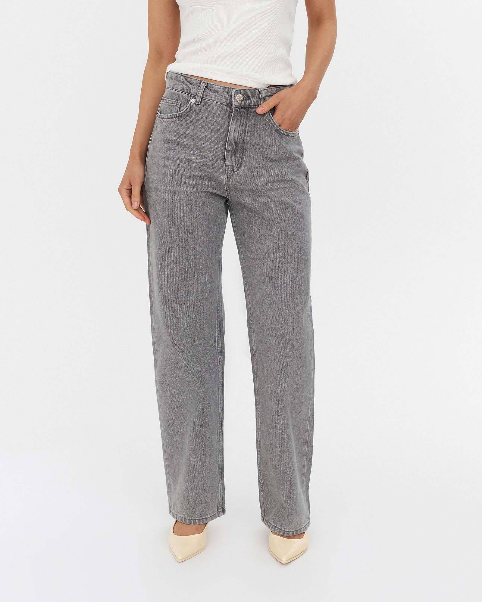Базові однотонні джинси прямого крою з горизонтальними потертостями. Модель з високою посадкою, п'ятьма кишенями та рівним обробленим низом....