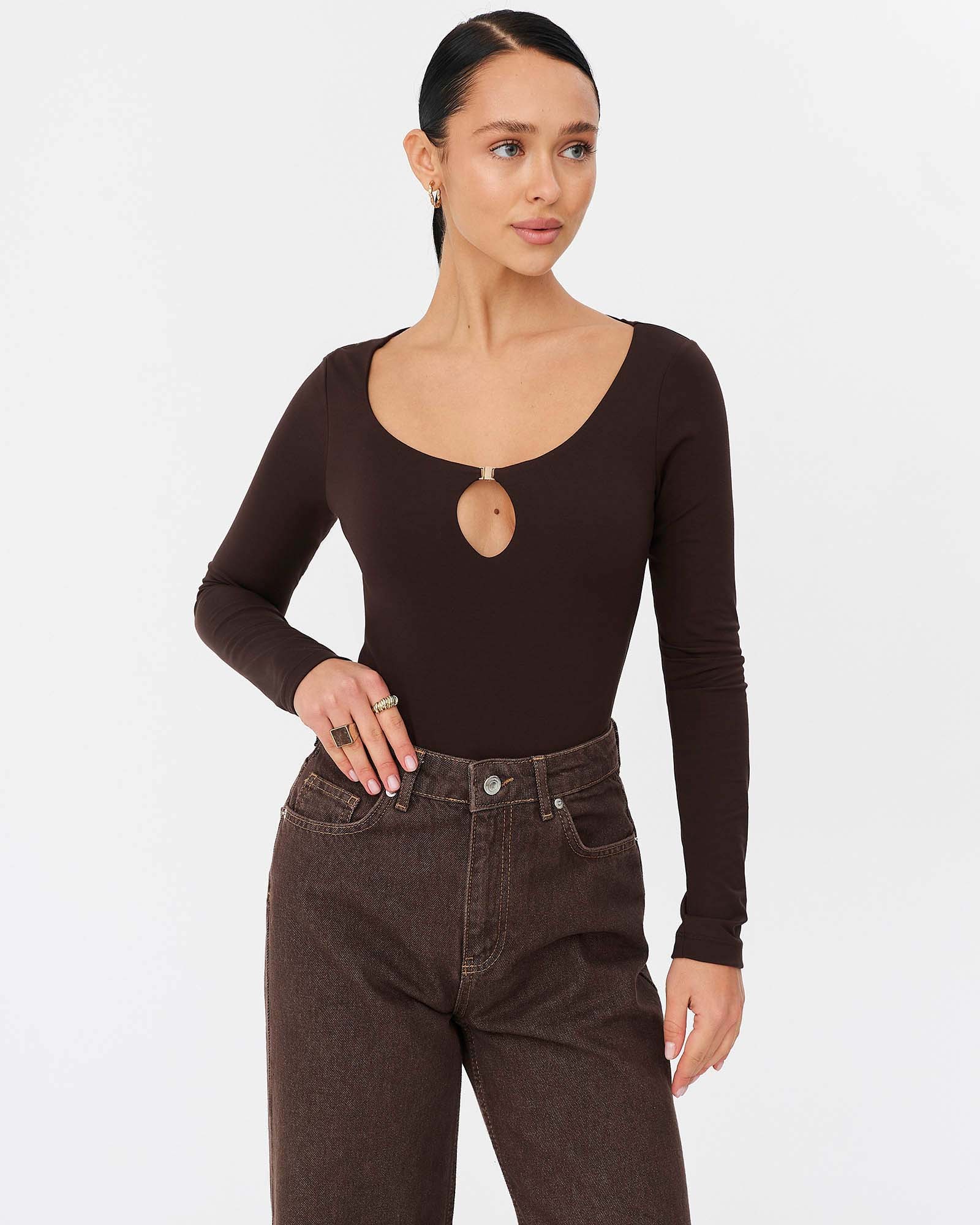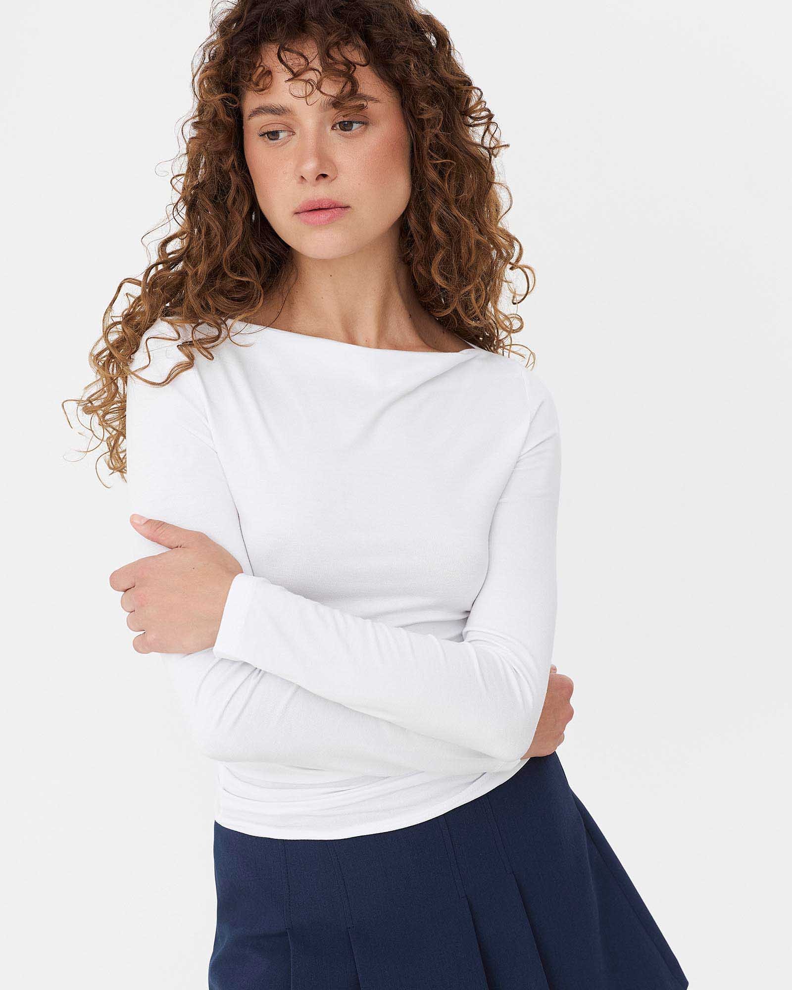 Однотонний базовий лонгслів зі скругленою горловиною, застібкою-поло на приховані ґудзики та довгими рукавами. На моделі розмір S.