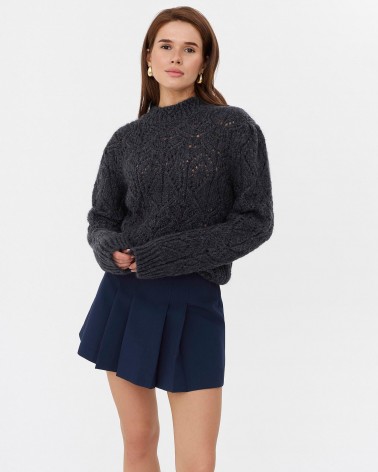 Однотонний вкорочений джемпер з перфорацією та коміром-стійкою. Модель прямого крою з довгими рукавами та опущеною лінією плечей.