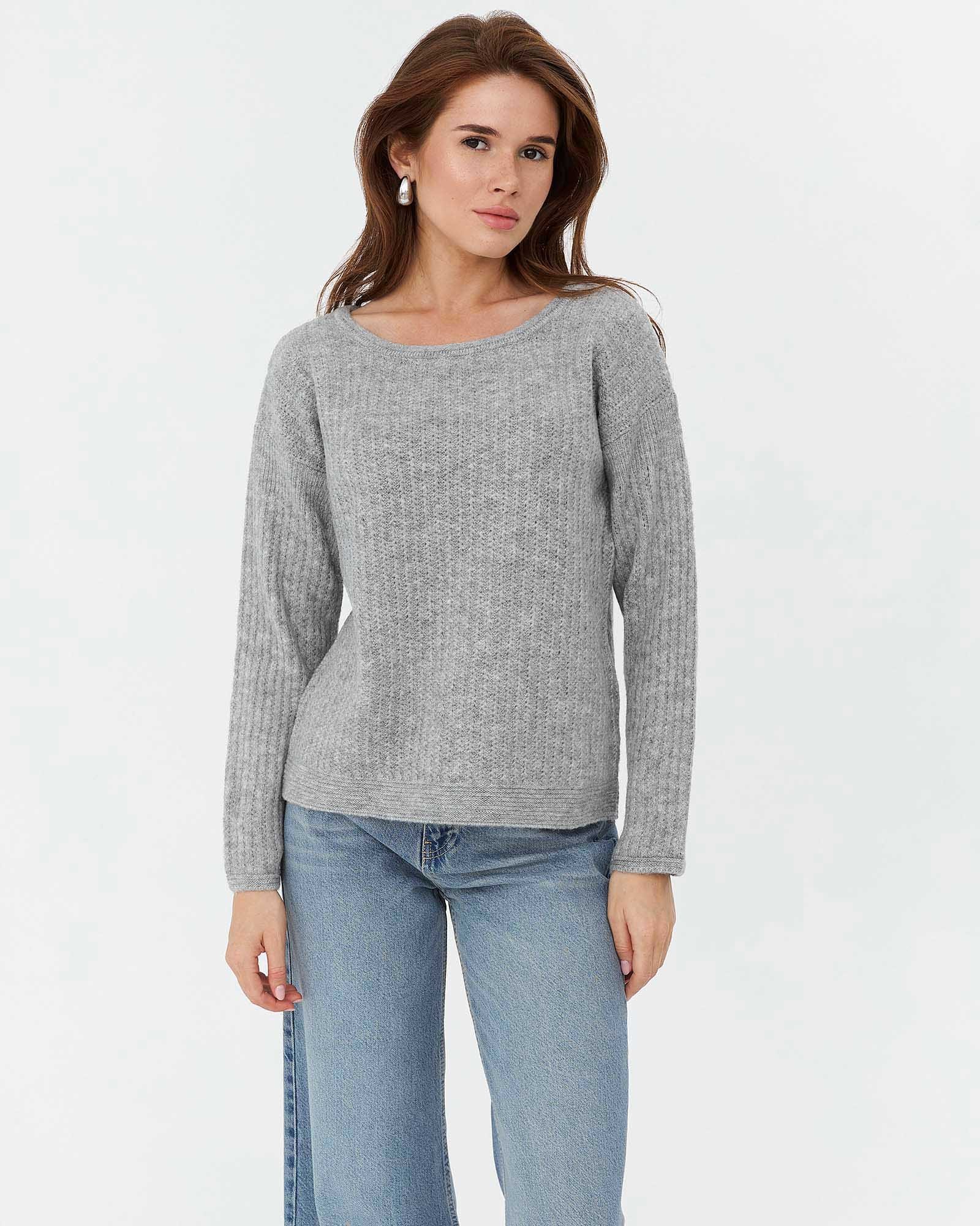 Однотонний джемпер з комбінованою в'язкою. Модель з круглою горловиною, опущеними плечовими швами та довгими рукавами.