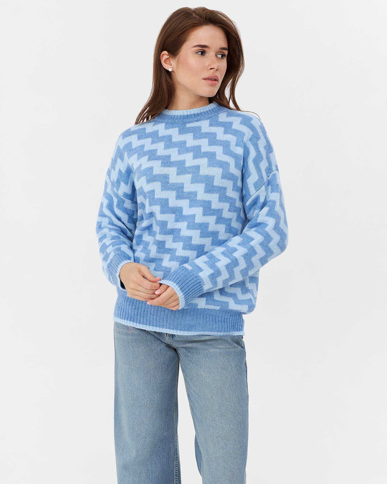 Стильний джемпер з геометричним принтом. Модель прямого крою з круглою горловиною, довгими рукавами та опущеною лінією плеча. Рукава та низ...