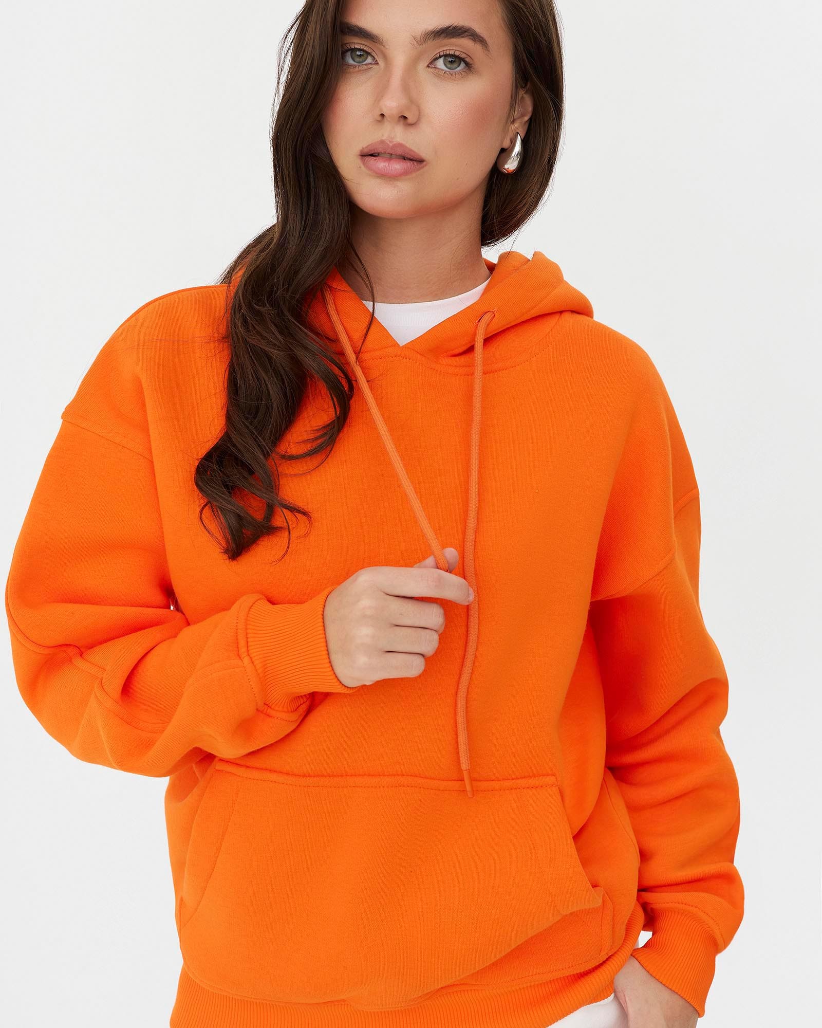 Однотонне худі з кишенею-кенгуру спереду та капюшоном зі шнурками для регулювання. Модель з декоративними швами, широкими манжетами та довгими...