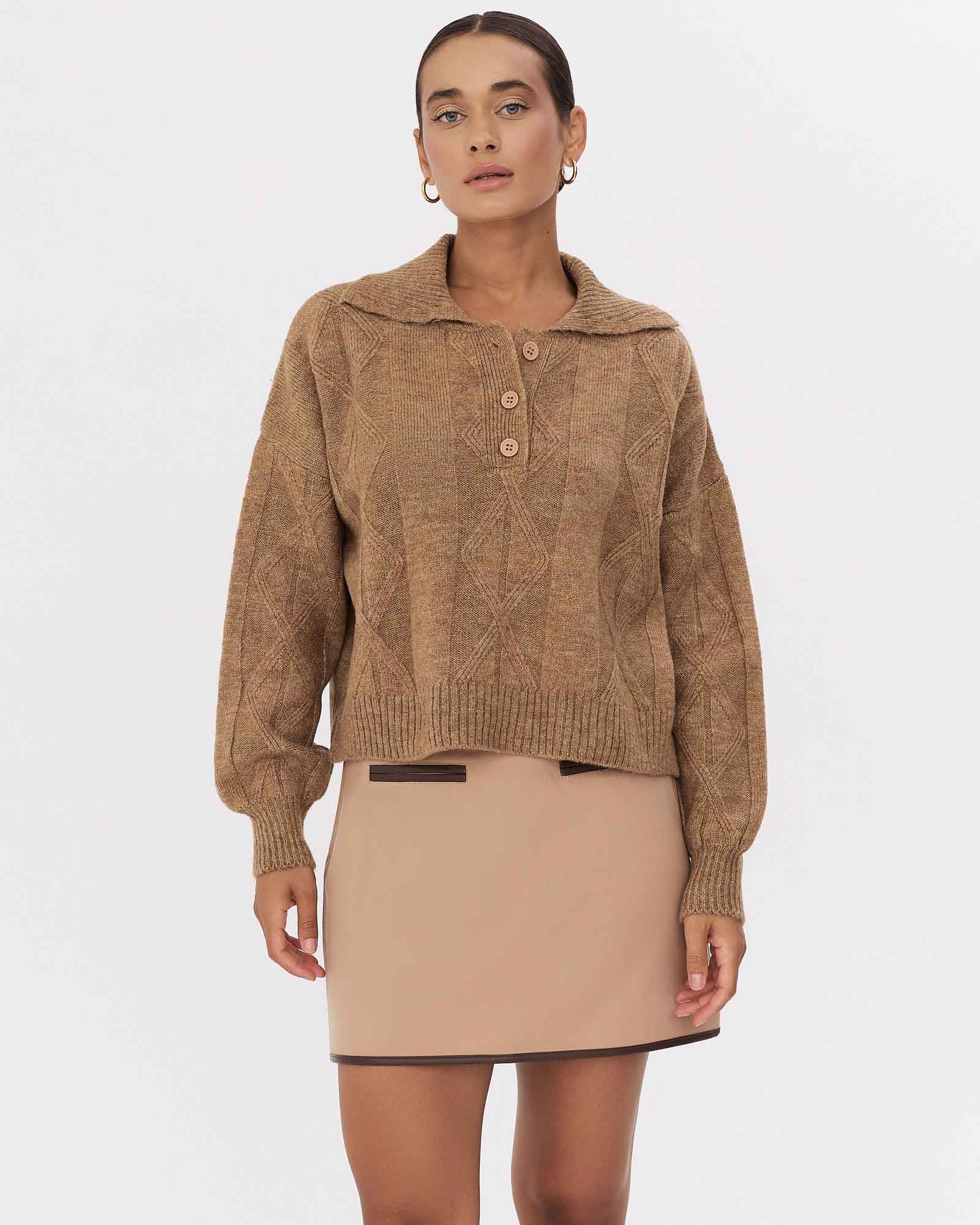 Однотонний светр вільного крою з сорочковим коміром-поло із застібкою на ґудзики. Модель з геометричним плетенням, довгими рукавами з широкими...