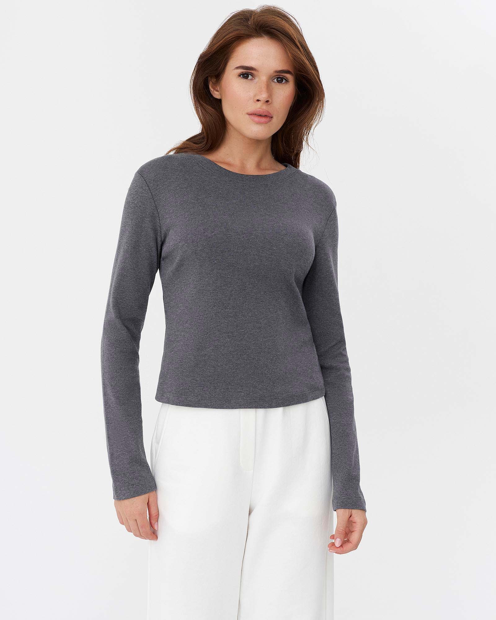 Базовий однотонний лонгслів приталеного крою. Модель з круглою горловиною та довгими рукавами. На моделі розмір S.