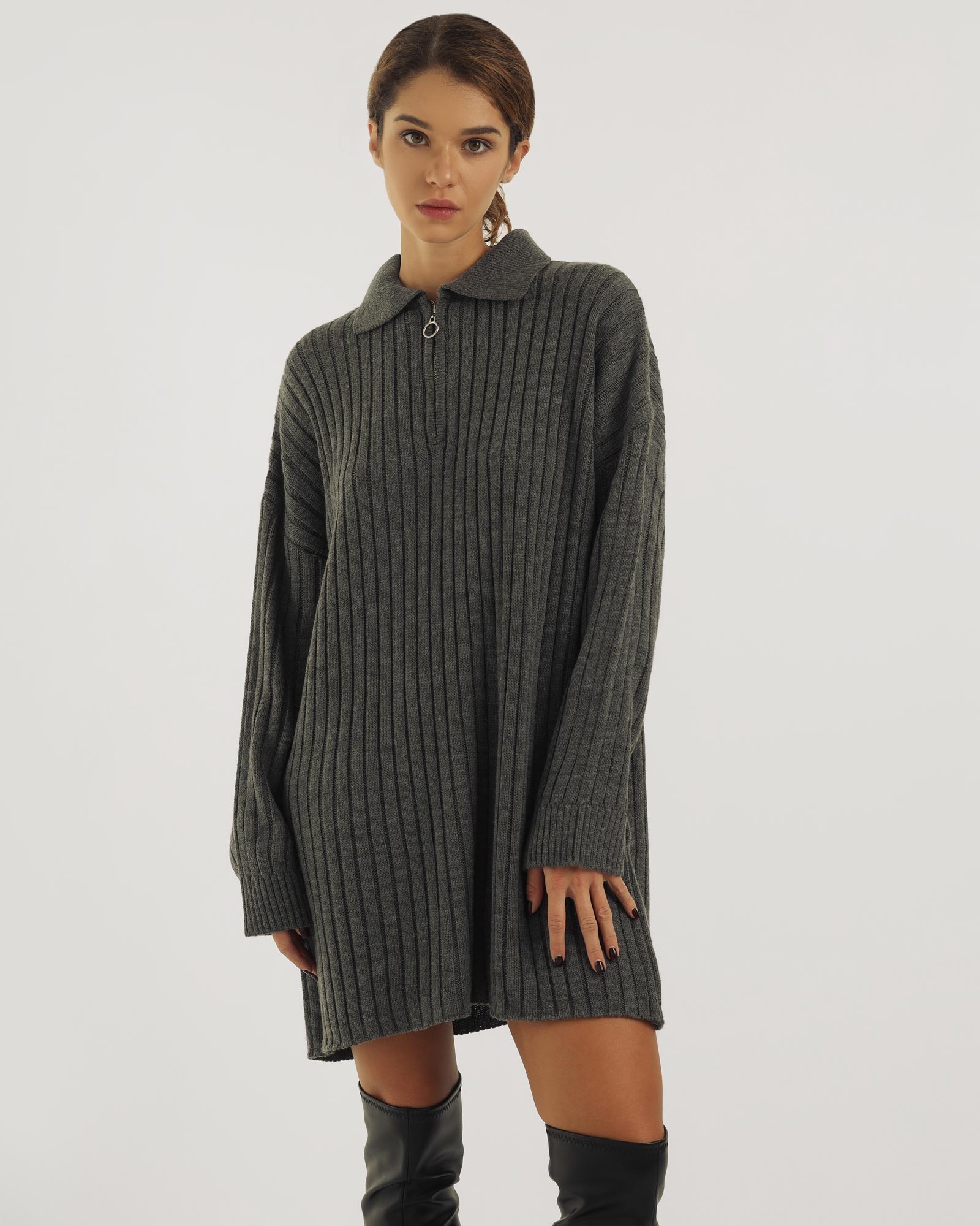 Однотонна трикотажна сукня довжини міні з широким відкладним коміром, відкритими плечима та довгими рукавами.
