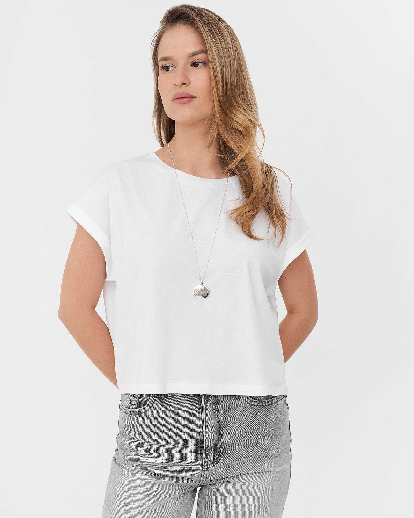 Однотонна вкорочена футболка вільного крою з круглим вирізом та короткими рукавами з манжетами. На моделі розмір S.