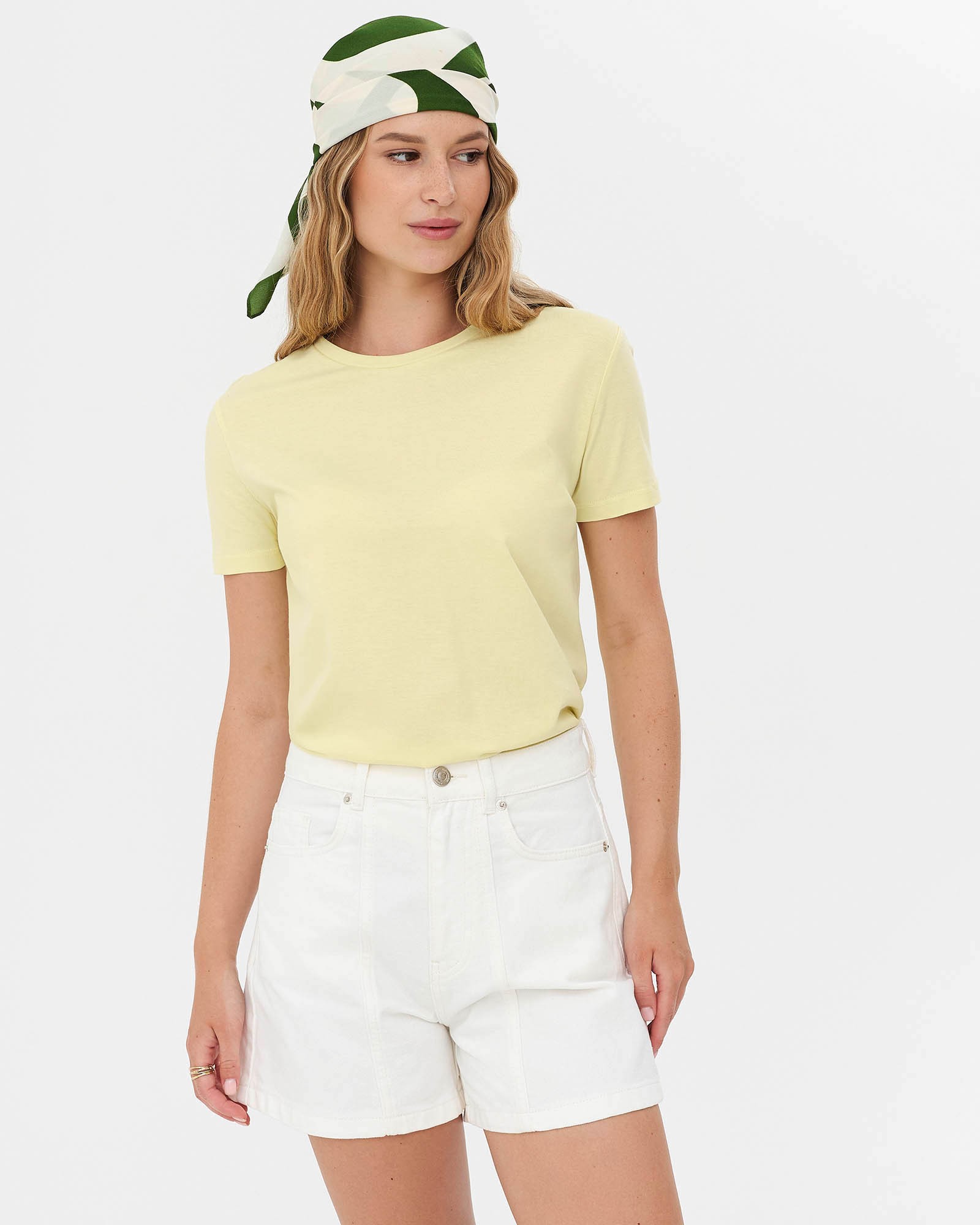 Однотонна футболка вільного крою з круглим вирізом та короткими рукавами. Модель з асиметричним низом, подовжена ззаду. На моделі розмір S.