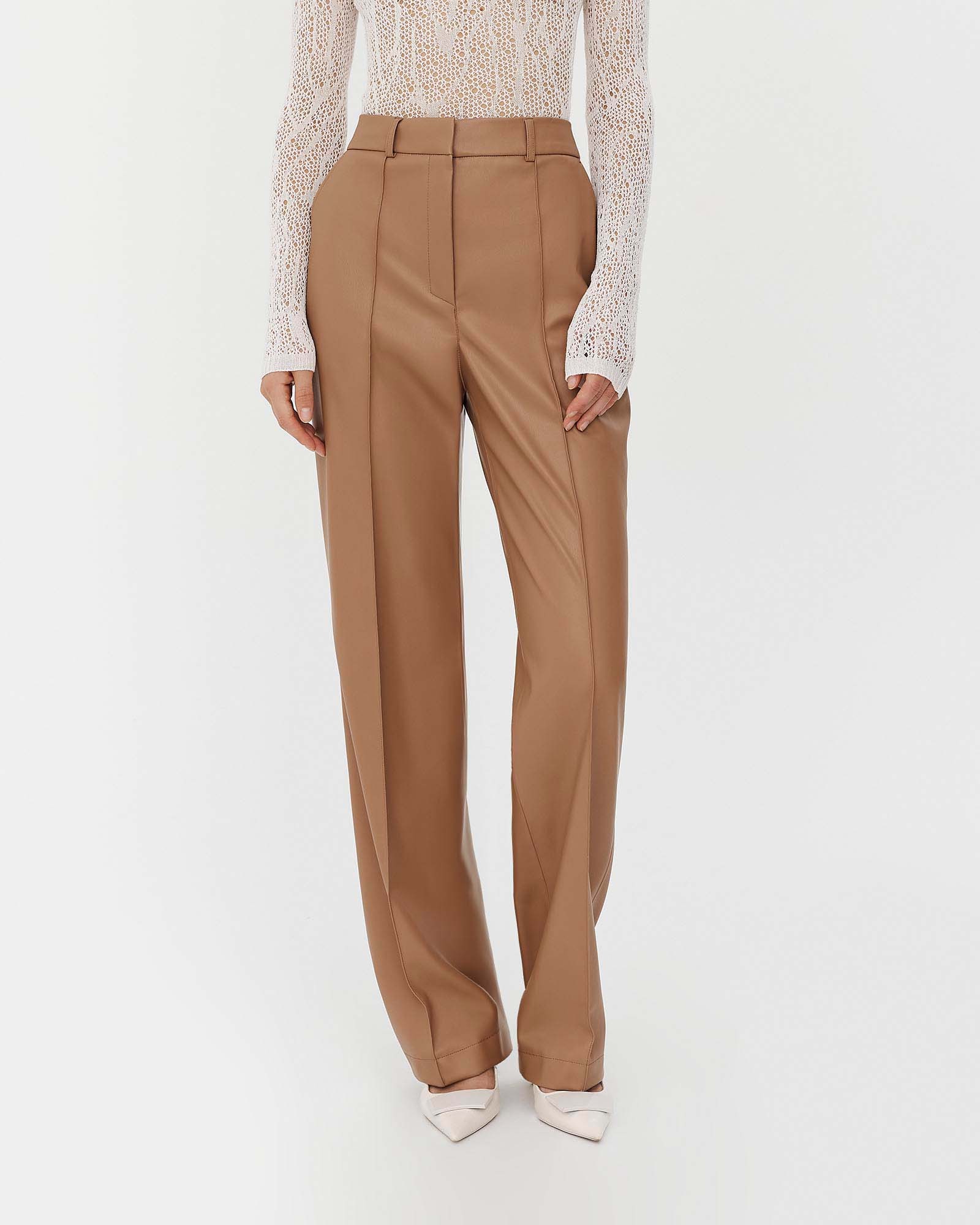 Штани прямого крою зі штучної шкіри. Модель з високою посадкою, декоративними швами, боковими кишенями та накладними кишенями ззаду. Петельки для...