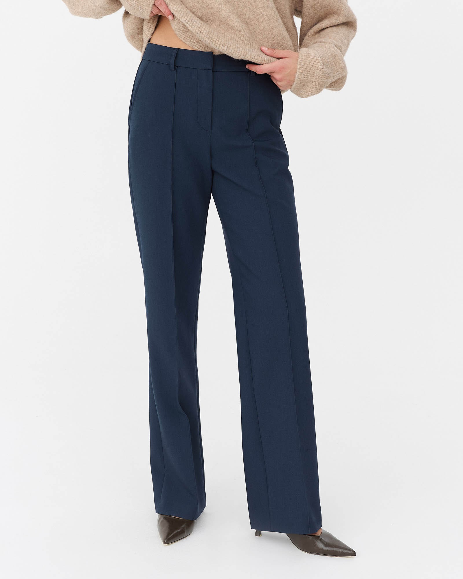 Однотонні штани прямого крою з високою посадкою. Модель з декоративними швами спереду, боковими кишенями та імітацією кишені ззаду. Застібаються...