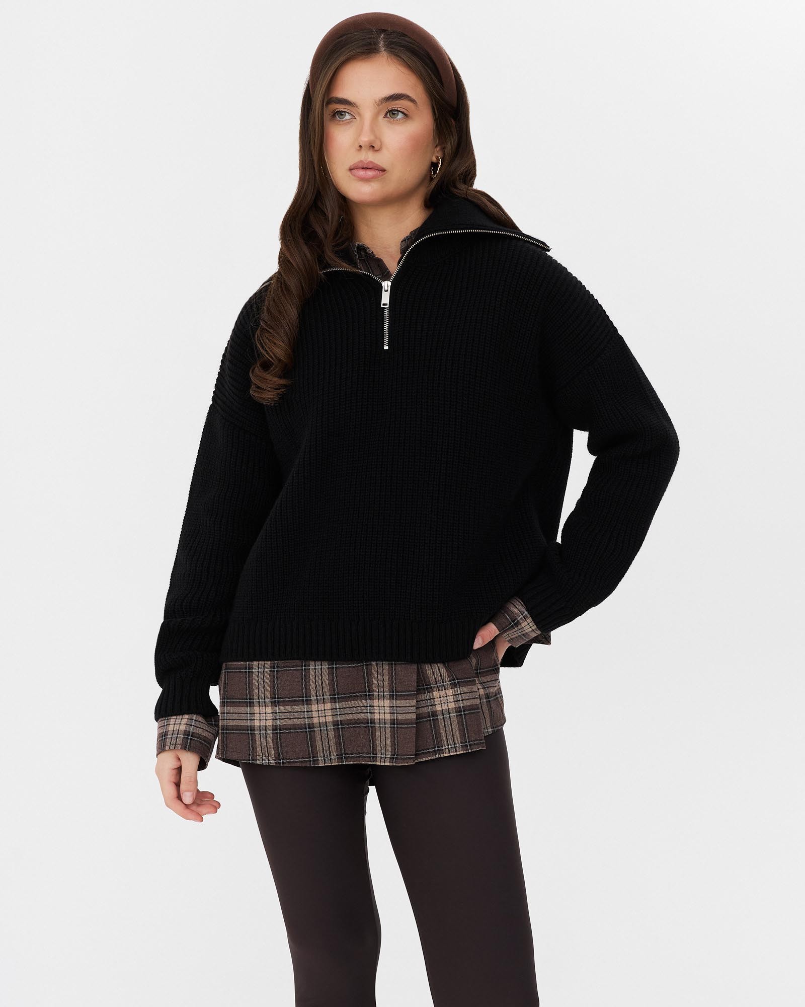 Однотонний светр прямого крою. Модель з широким відкладним коміром із застібкою на блискавку, опущеними плечовими швами та довгими рукавами.