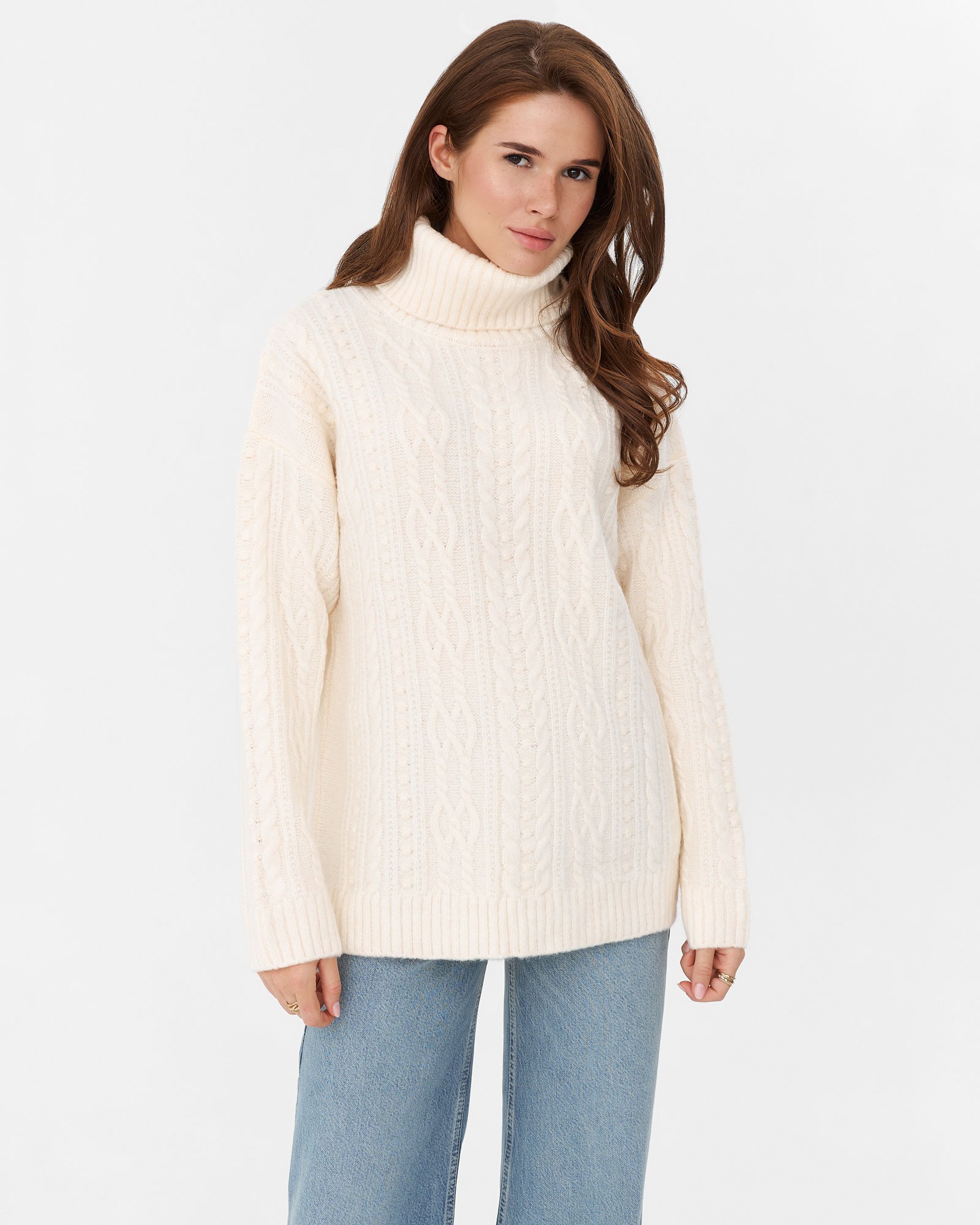Однотонний подовжений светр прямого крою. Модель з високою горловиною, що завертається, комбінованою в'язкою, опущеними плечовими швами та довгими...