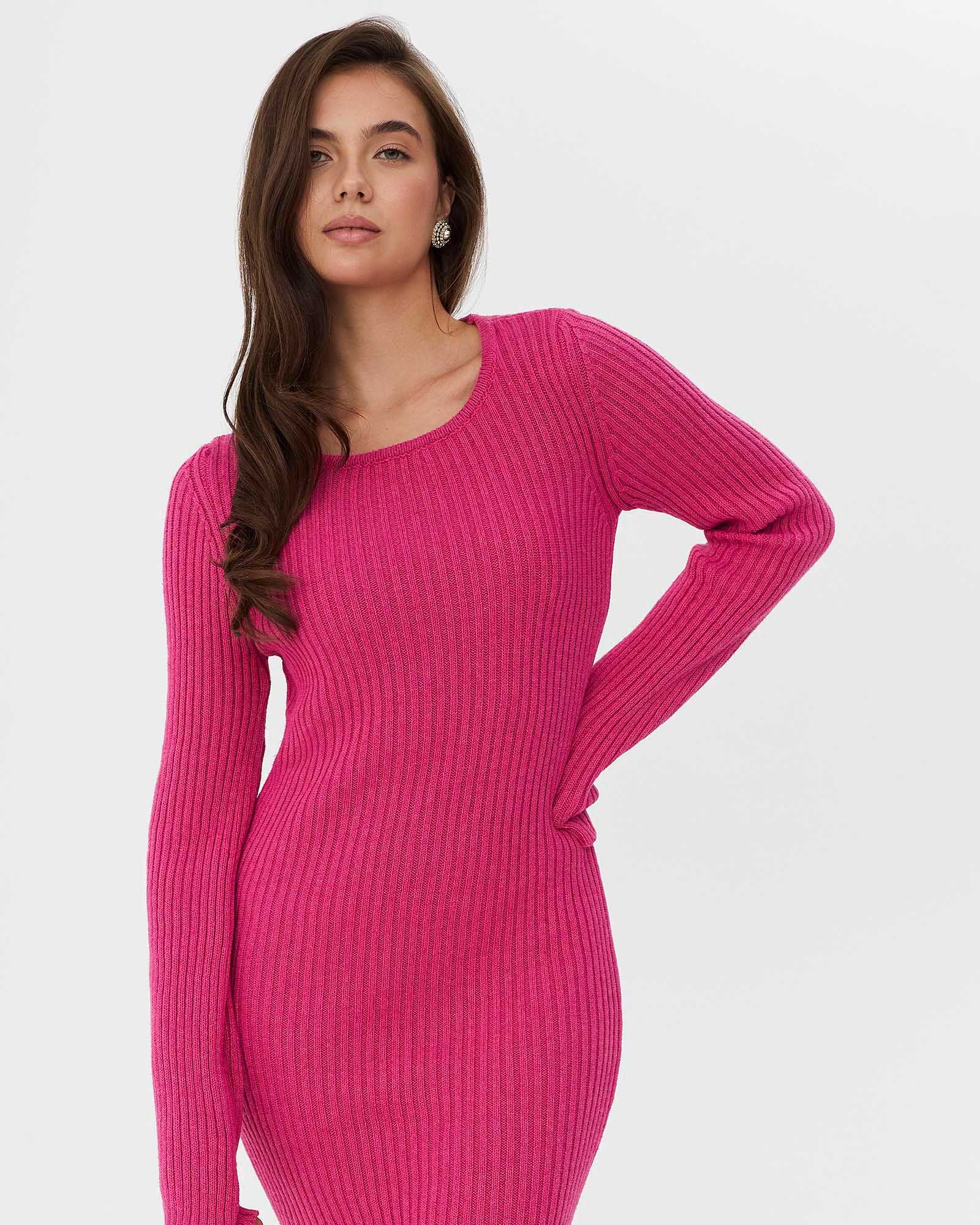 Однотонна силуетна трикотажна сукня з вирізом та шнурівкою на спині. Модель з круглою горловиною, довгими рукавами та розрізом ззаду.