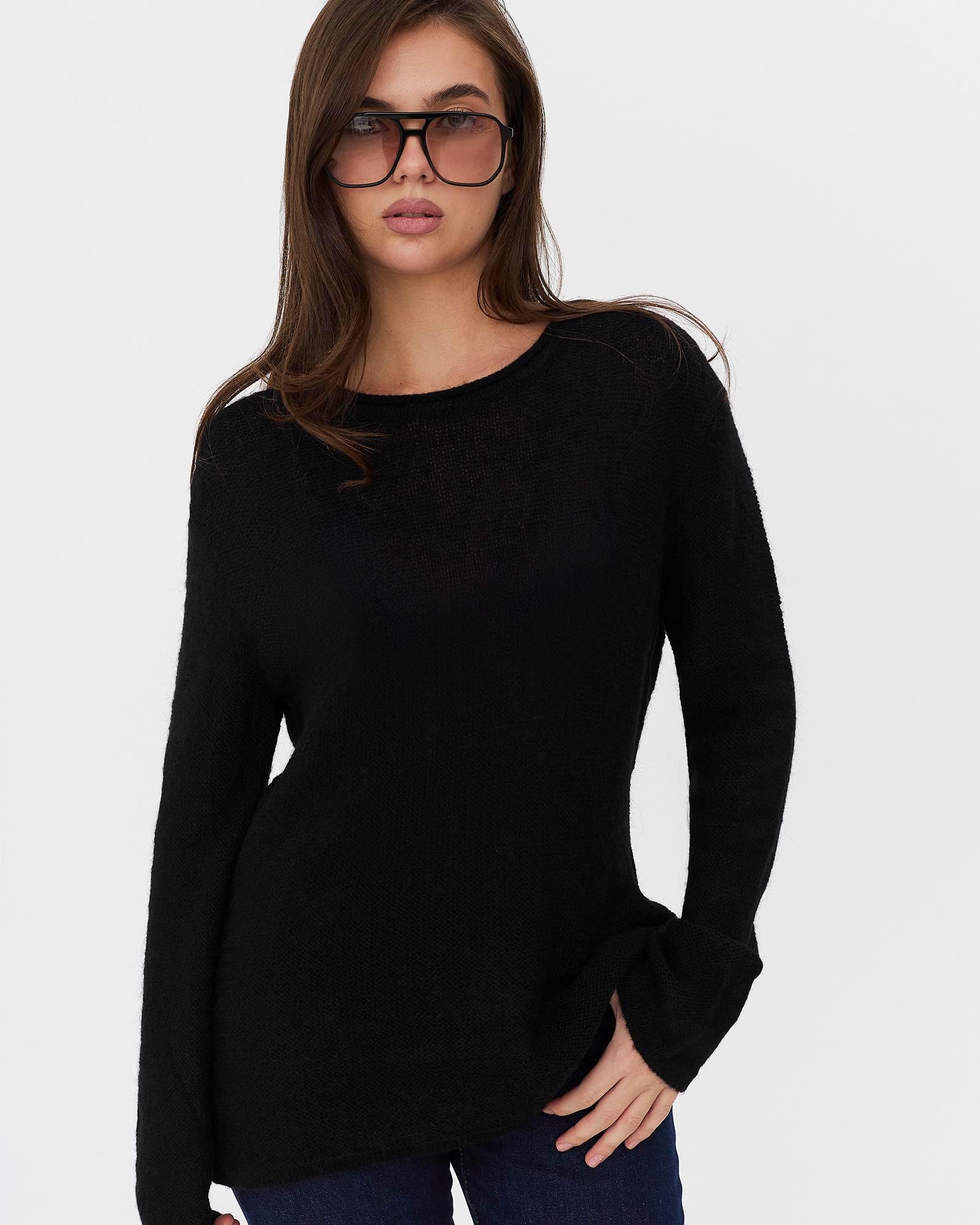 Однотонний джемпер з комбінованою в'язкою. Модель з круглою горловиною, опущеними плечовими швами та довгими рукавами.