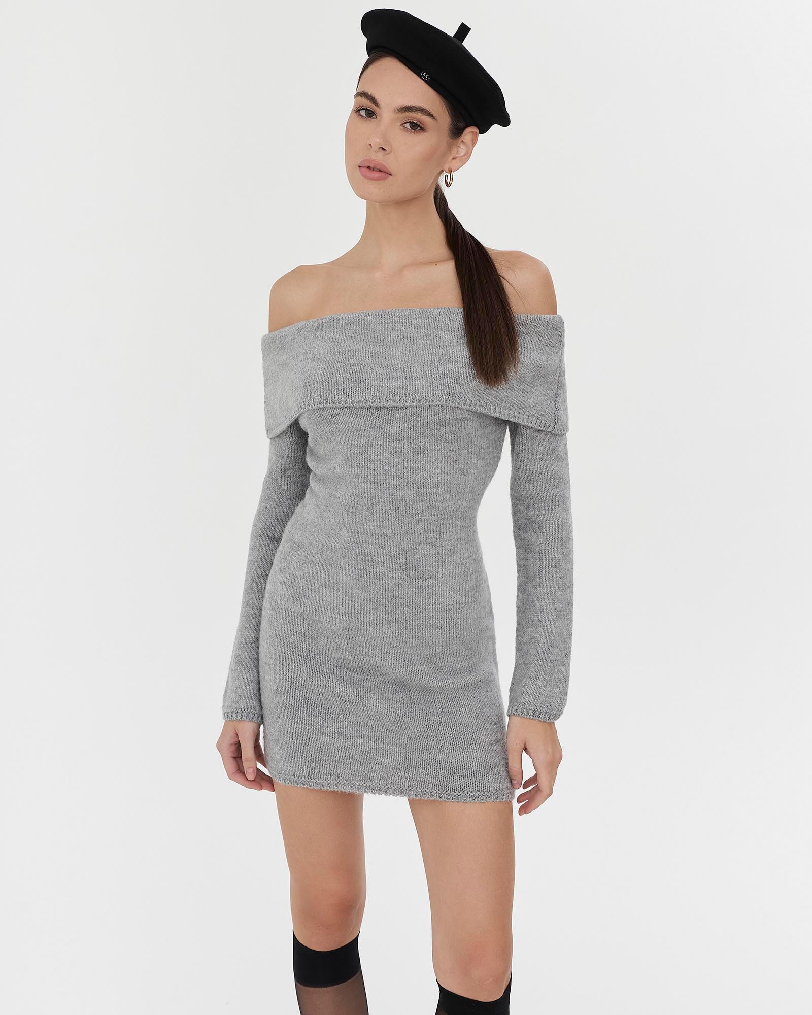 Однотонна трикотажна сукня довжини міні з широким відкладним коміром, відкритими плечима та довгими рукавами.