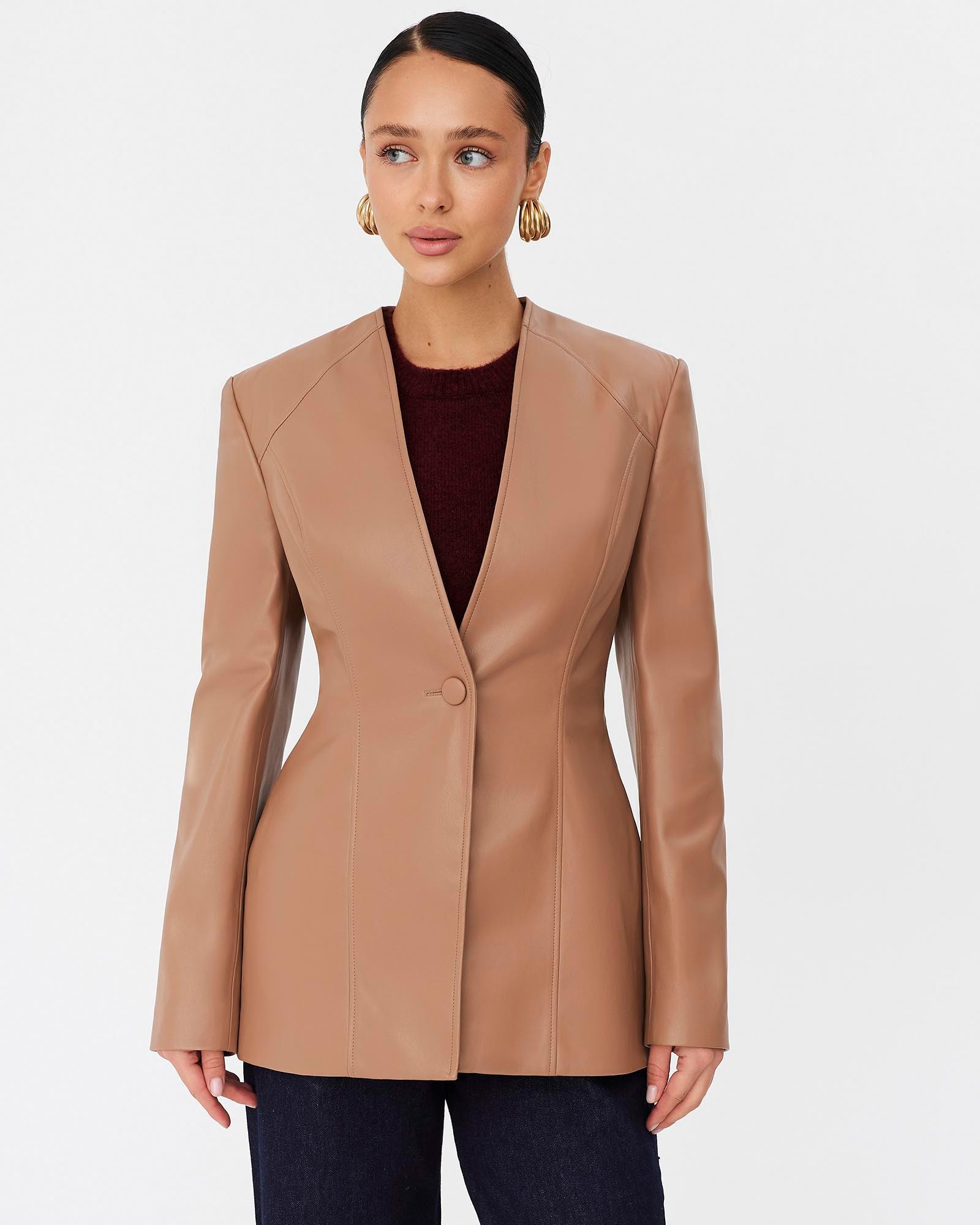 Стильний жакет зі штучної шкіри приталеного крою. Однобортна модель з довгими рукавами та шліцем ззаду. Застібається на ґудзик спереду. На...
