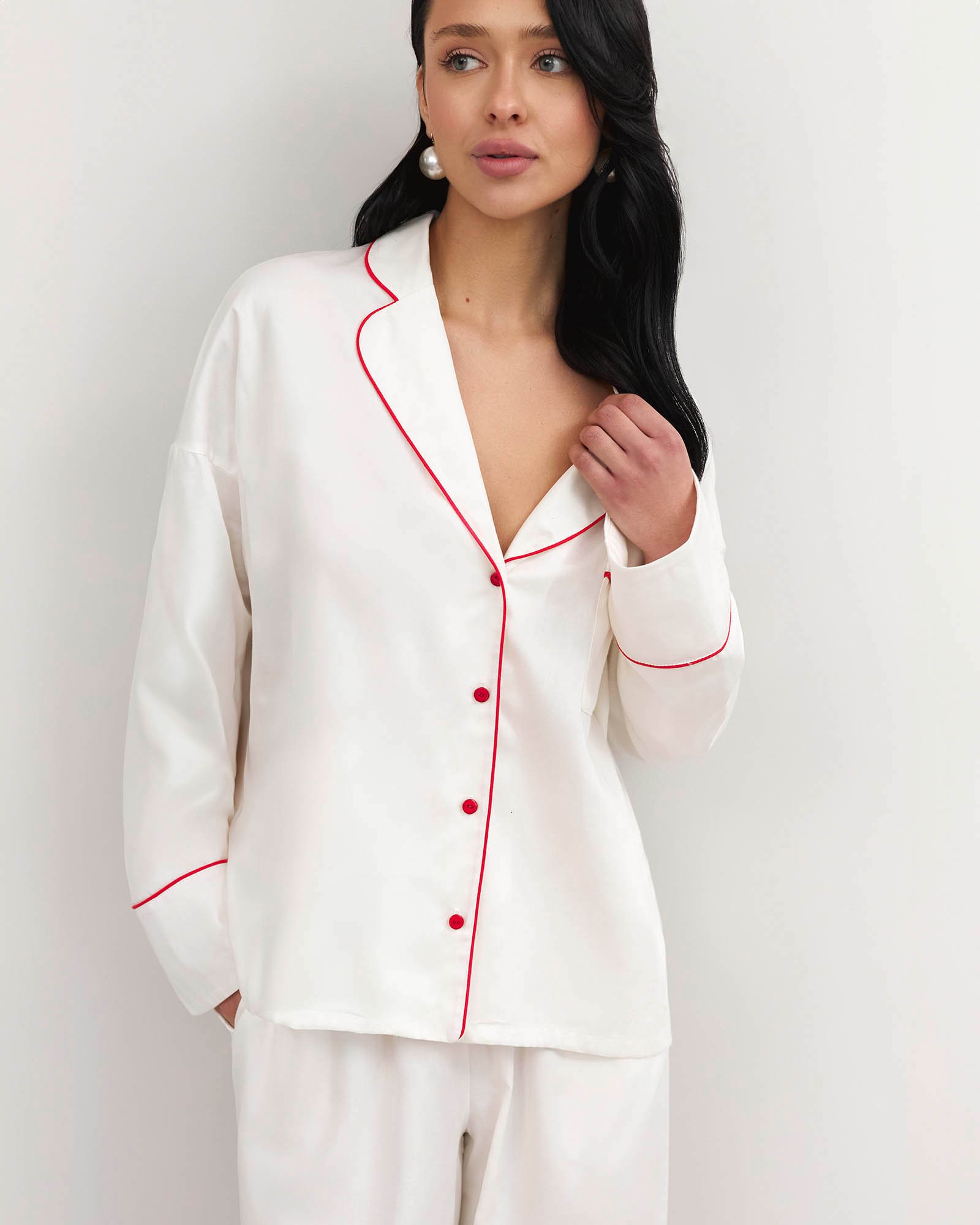 Сорочка вільного крою з контрастним кантом, нагрудною кишенею, довгими рукавами та відкладним сорочковим коміром. Застібається на ґудзики спереду....