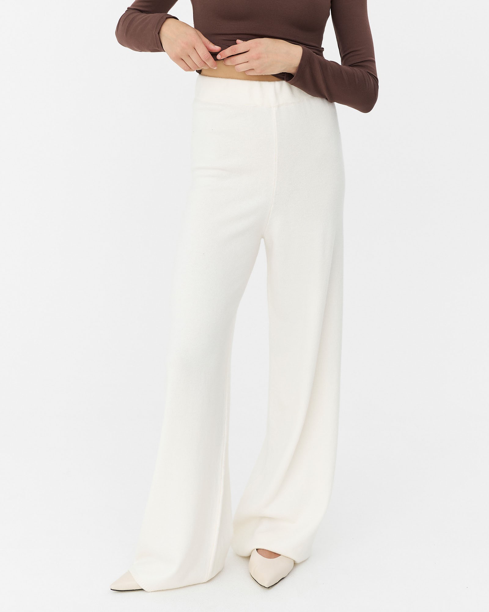 Однотонні трикотажні штани-палацо з високою посадкою, еластичним поясом та рівним обробленим низом.