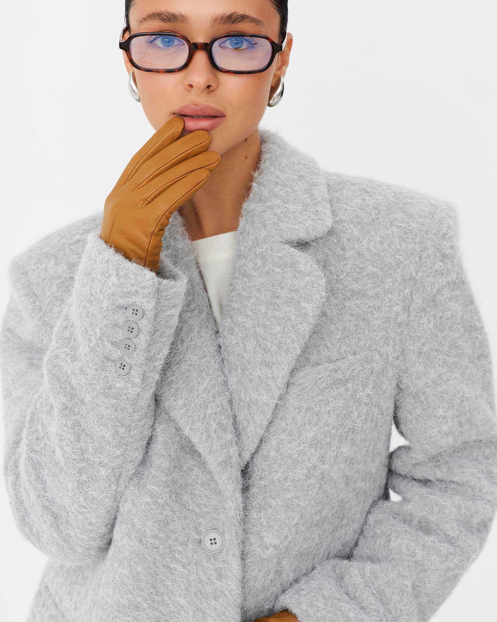 Вкорочений твідовий жакет прямого крою з круглою горловиною, довгими руками та імітацією кишень з клапанами. Застібається на золотисті ґудзики...